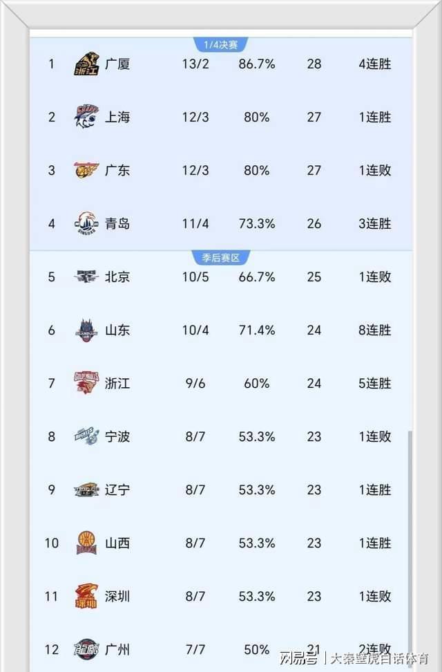②、青岛队11胜4负反超北京队的10胜5负,排名第4;