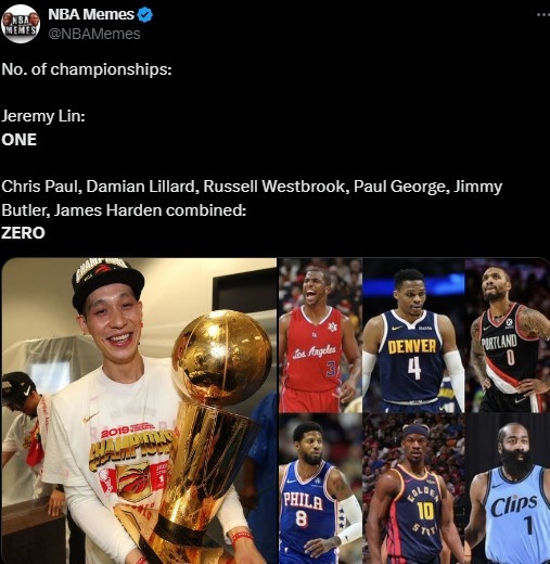 “哈登、保罗、利拉德、威少、乔治和巴特勒加起来0冠,但林书豪有1冠。”NBA Memes写道。